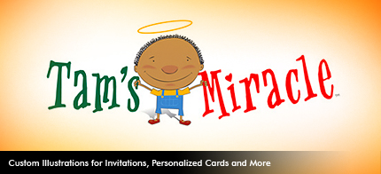Tam’s Miracle was created by a local, talented designer/illustrator to handcraft your message which is then assigned to a custom invitation, announcement or card of your choosing.